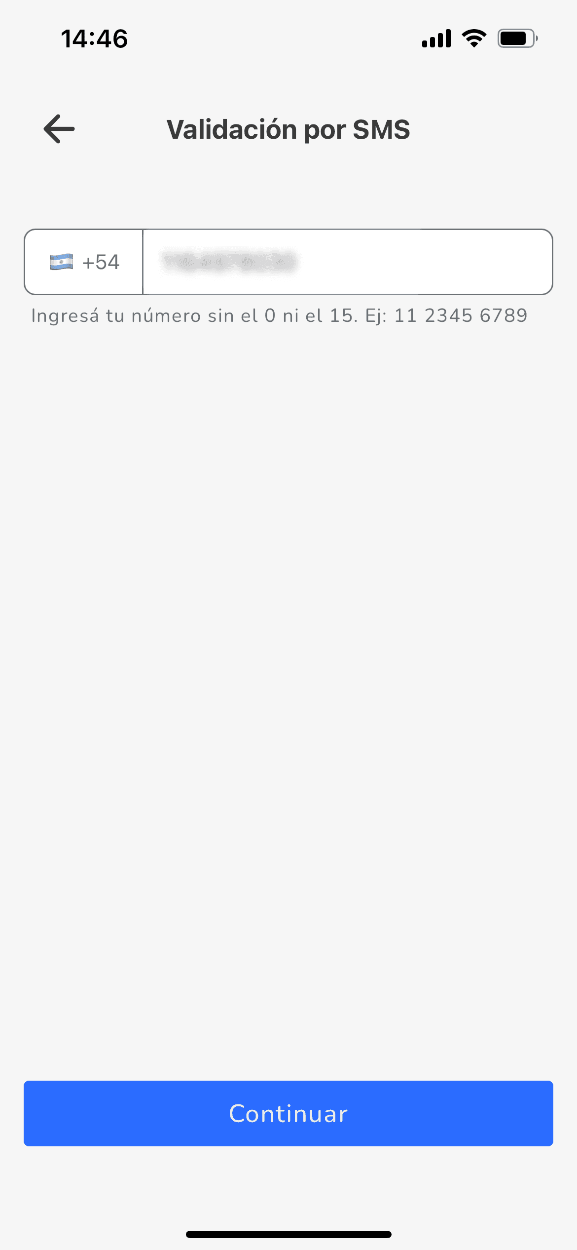 Si seleccionaste validar por SMS, tenes que ingresar tu número de teléfono y presionar Continuar.