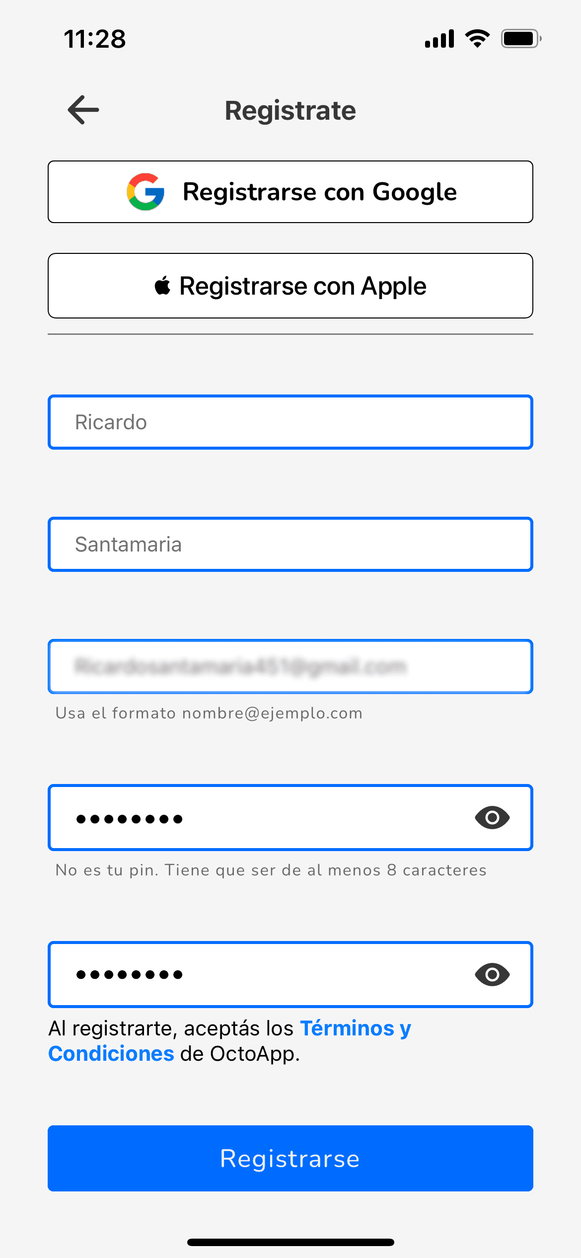 Atención: Vas a tener que crear una contraseña de al menos 8 caracteres.