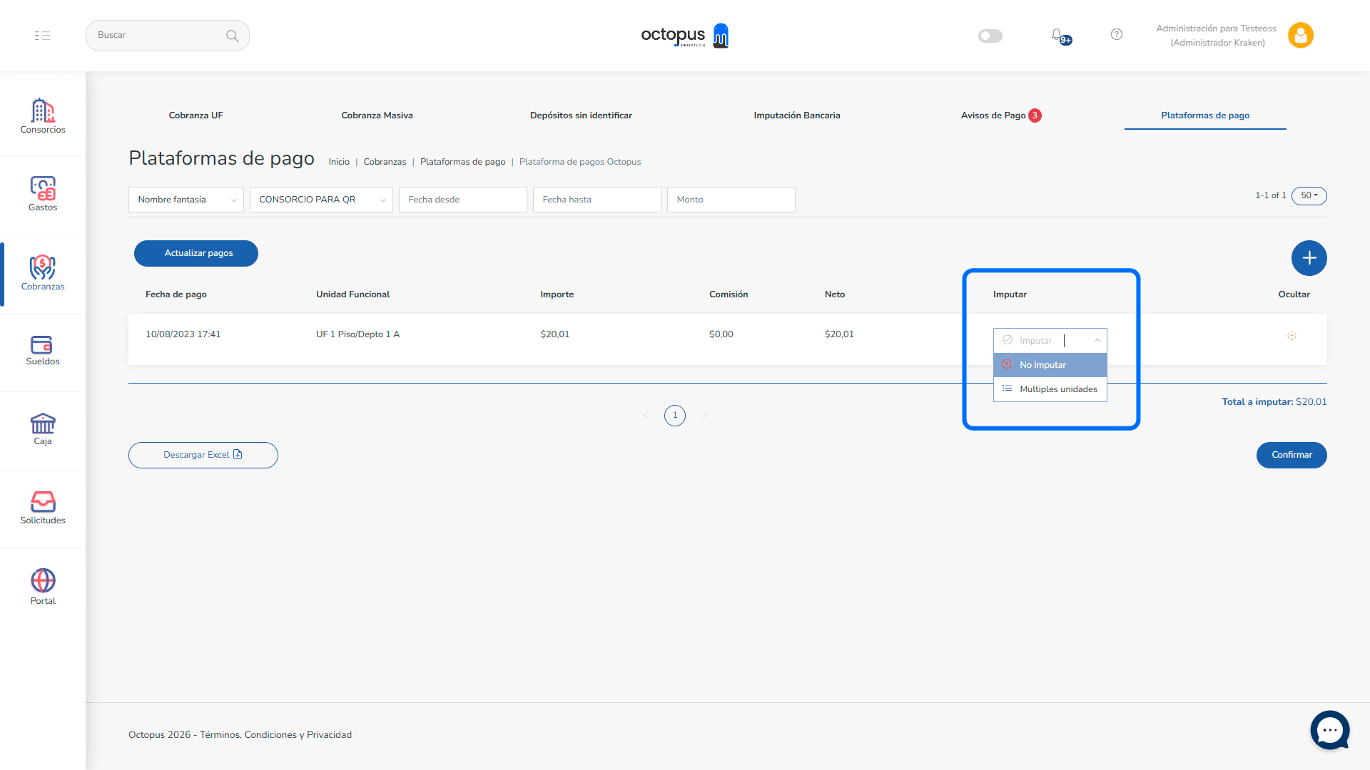 Si imputás a múltiples unidades, el total debe coincidir con el monto recibido.