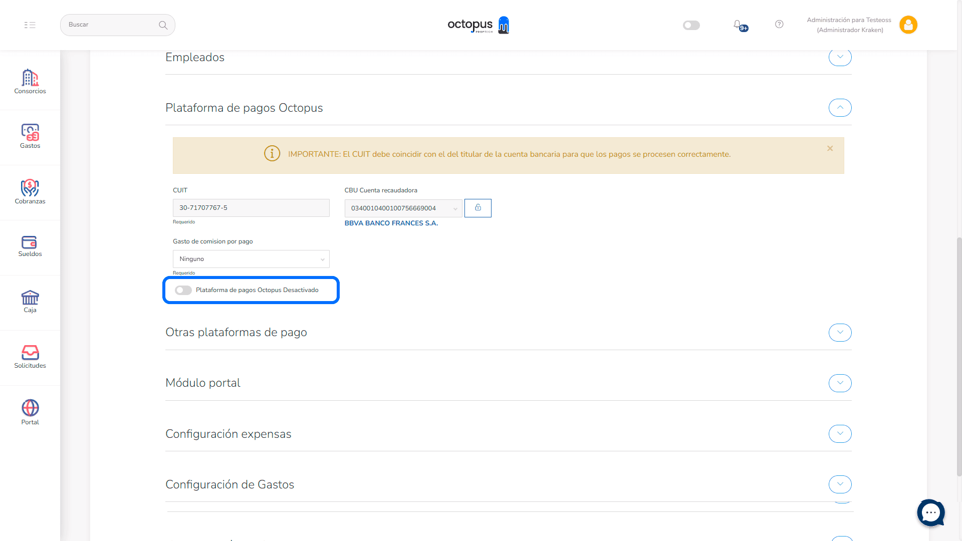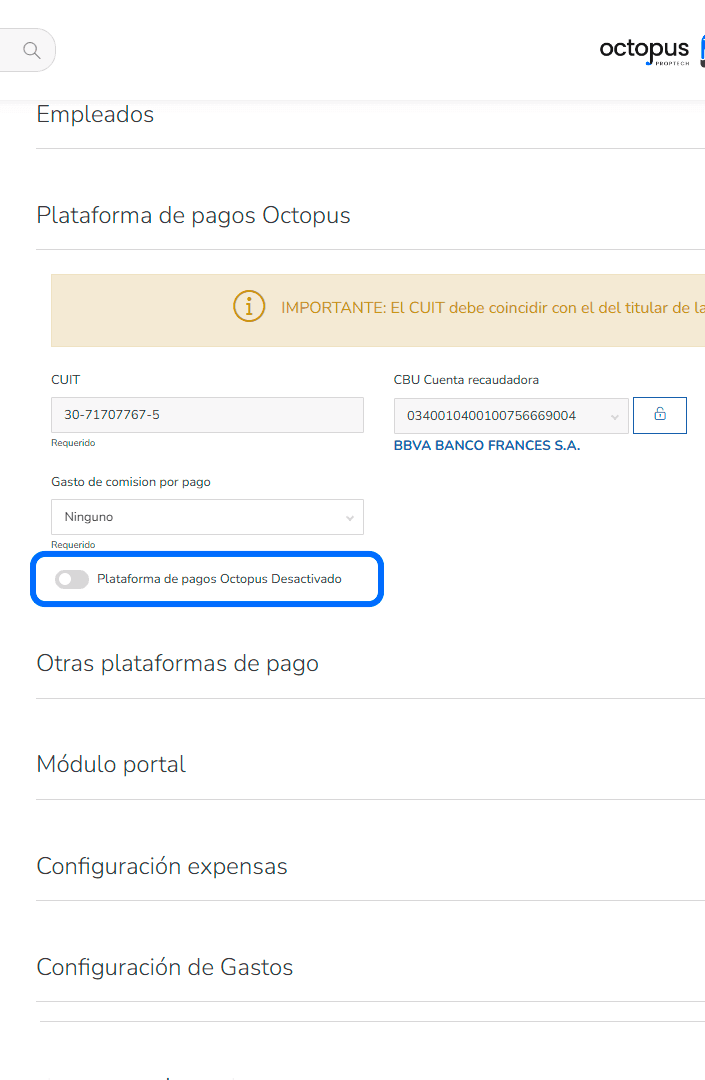 Bajá hasta la sección Plataforma de pagos Octopus y activá el switch.
