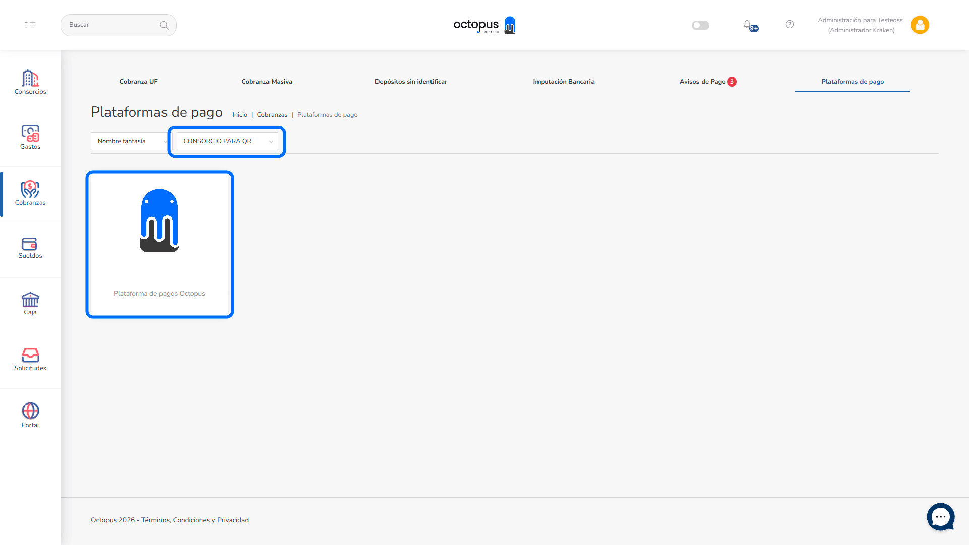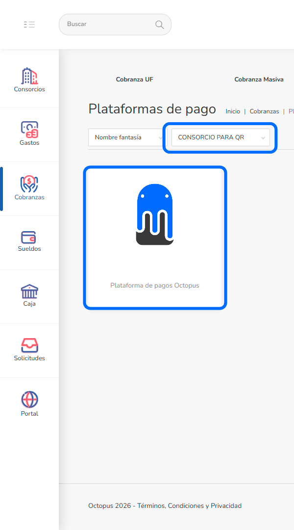 Elegí el consorcio que querés gestionar y seleccioná Plataforma de pagos Octopus para ver los pagos realizados.